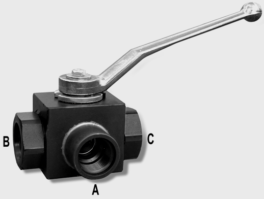 3-Ported Ball Valves which can be used as high pressure selector valves. Flow at A is connected to either B or C. (All 3 are partially connected in intermediate positions)