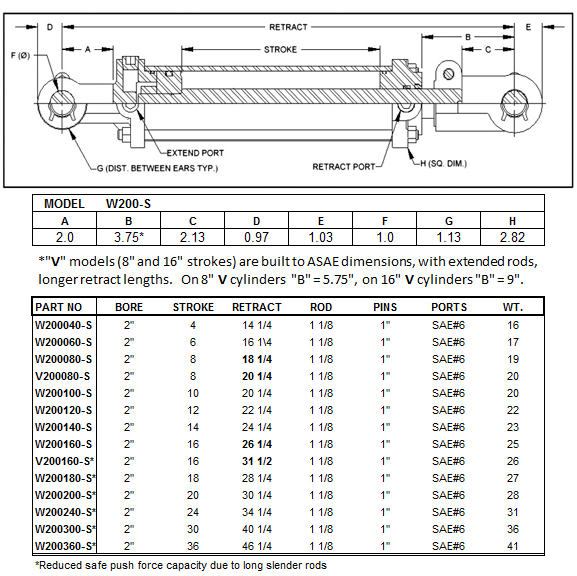2" bore standard tie rod cylinders, strokes from 4" to 36", 1.5" or 2" rods, SAE #6 O-ring ports, 1" clevis pins included. 2500 PSI