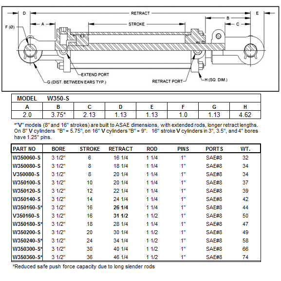 3.5" bore standard tie rod cylinders, strokes from 6" to 36". 2500 PSI, 1" clevis pins included (1.25" pins on V350160-S)