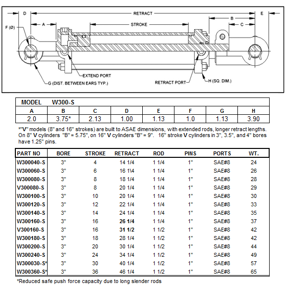 3" bore Prince Wolverine standard tie rod cylinders, strokes from 4" to 36". 2500 PSI, 1" clevis pins included (1.25" pins on V300160-S)